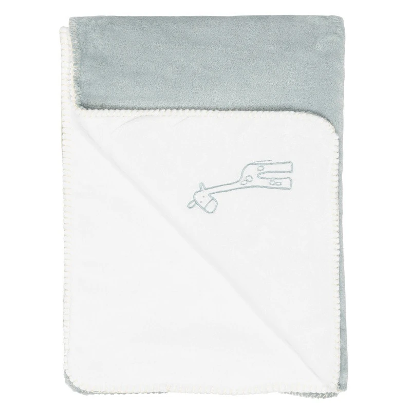 2 faces, 2 couleurs…. Voici ce que vous offre cette superbe couverture 75 x 100 cm de la collection Luna & Axel de Nattou. Elle est, en effet, réversible, réalisée en velours Supersoft et vous propose un côté uni vert sauge, l’autre blanc décoré par la présence discrète de Luna, la charmante girafe.