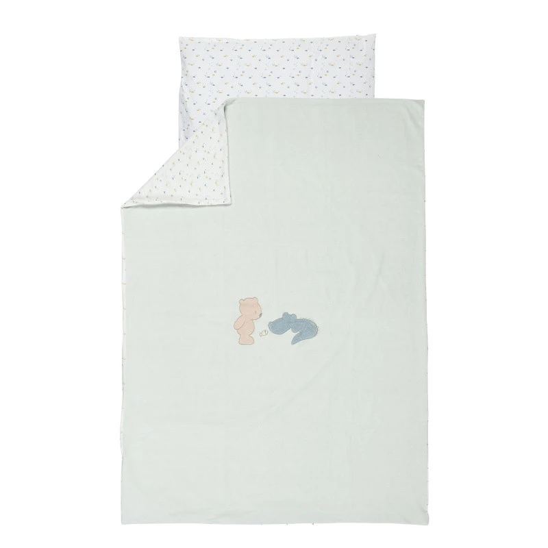 - Housse de couette réversible : un côté uni vert avec les personnages de la collection en décoration, un côté imprimé de petits poissons.