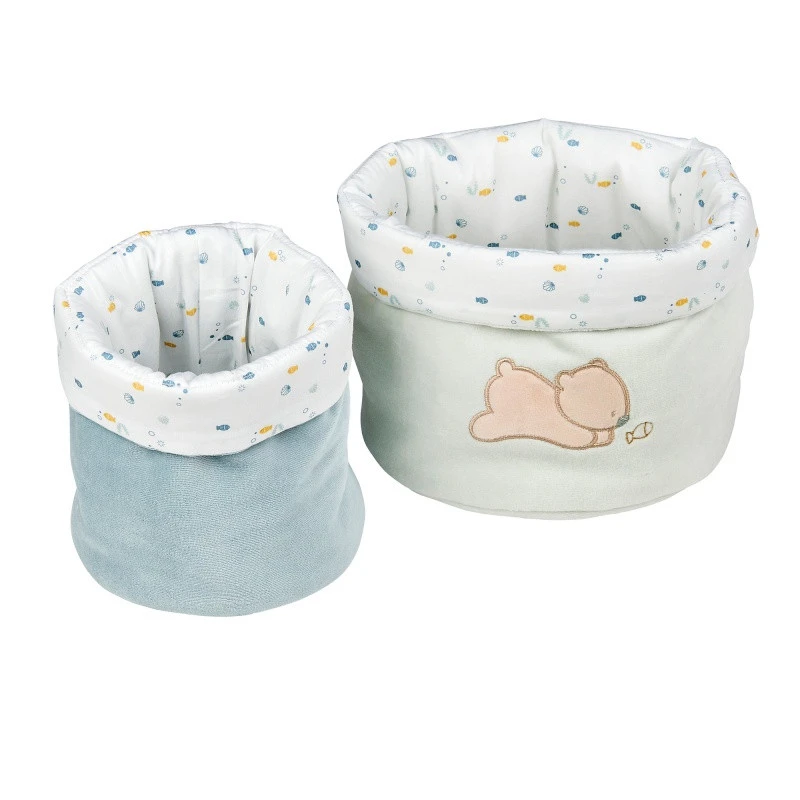 Pour réaliser ce lot de 2 paniers Roméo, Jules & Sally, Nattou a choisi d’associer un velours tout doux à l’extérieur, vert tendre pour l’un, bleu pour l’autre, avec une popeline imprimée de petits poissons à l’intérieur. Leurs styles coordonnés, quoique légèrement différents, ajoutent sans aucun doute une touche de charme à votre décoration.