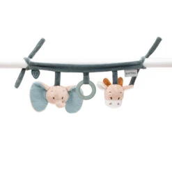 - 3 jouets suspendus : une tête de girafe, une tête d’éléphant et un anneau de dentition.
