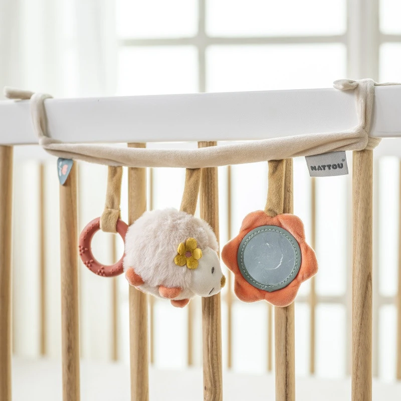 - 3 jouets suspendus : Zoë la petite hérissonne, un miroir en forme de fleur et un anneau en silicone.