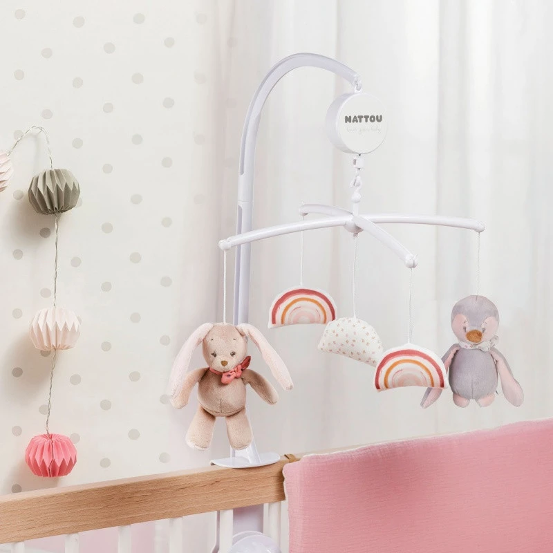 Ce joli petit mobile fabriqué par Nattou reprend tous les personnages du thème Sasha & Pauline avec Sasha l’adorable pingouin et Pauline la jolie lapine, trop mignonnes avec leurs petits bandanas et leurs petits nœuds sur la tête ! Ces deux copines sont accompagnées par deux petit arc en ciels très girly ainsi qu’un petit nuage multicolore au centre pour un ensemble tout doux qui apaisera votre petite princesse !