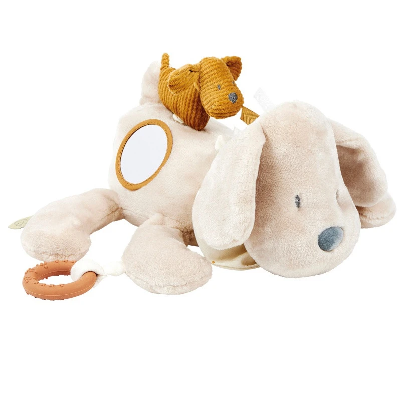 La peluche d’activités Charlie de Nattou est à la fois un tendre doudou à câliner et un jouet d’éveil destiné aux tout-petits. Ultra doux, il prend la forme d’un superbe chien vanille qui porte sur son dos un petit chiot caramel.