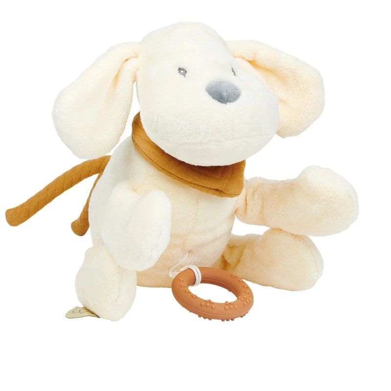 En effet, dans son corps souple, cette peluche Charlie le chien de Nattou cache une boîte à musique qui fait entendre les douces notes de la berceuse « La-Le-Lu ». Pour la mettre en marche, il suffit de tirer délicatement sur l’anneau en silicone. Rassuré par la présence de son fidèle compagnon, et bercé par la jolie mélodie, votre bébé plonge en douceur au pays des rêves.