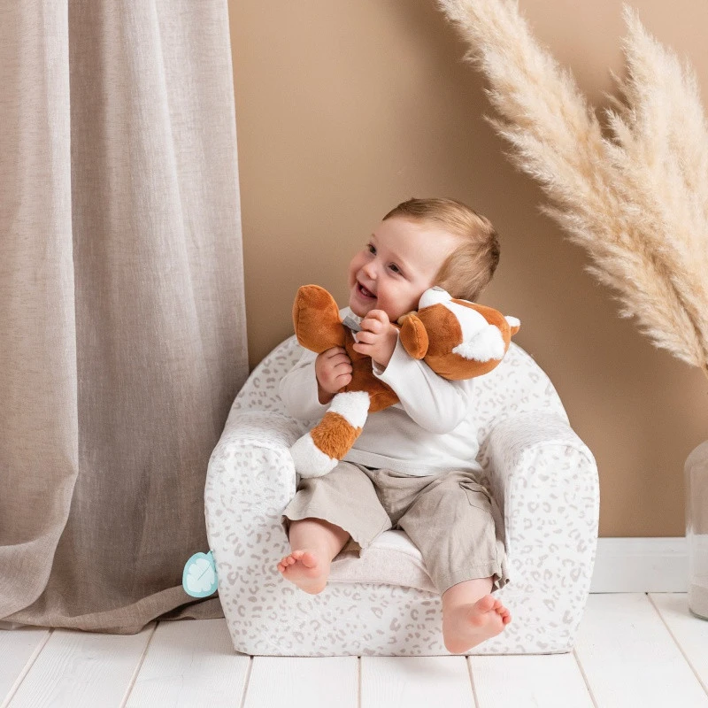 Confortablement assis sur son sofa, votre enfant dès 12 mois environ peut lire, jouer ou se reposer ! Ce ravissant fauteuil est réalisé en velours hyper doux, joliment tacheté de beige sur fond blanc… Comme le pelage de Jungo le léopard des neiges de Nattou ! Avec son ami Boris le panda roux, ils ont choisi de partager la vie de votre enfant et de lui créer un univers paisible, au travers d’une collection à leur nom, Boris & Jungo, composée d’un tour de lit, de couvertures, d’objets de décoration ou de toilette, de peluches et jouets premier âge…
