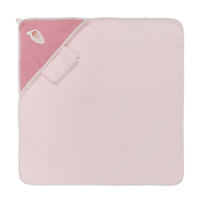 Cette jolie cape de bain rose est décorée d’un joli liseré multicolore et sa capuche, d’un rose plus soutenu est surmontée d’une belle plume.