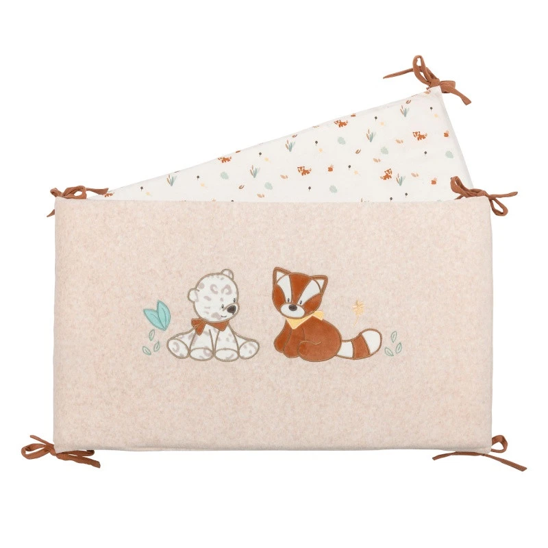 Le tour de lit de Nattou est réalisé en velours extrêmement doux, légèrement rembourré ; il associe un imprimé délicat de chaque côté et un uni beige au centre, où sont tranquillement installés les deux inséparables amis Boris et Jungo. Sachez également que le tour de lit est réversible si vous souhaitez changer de style.